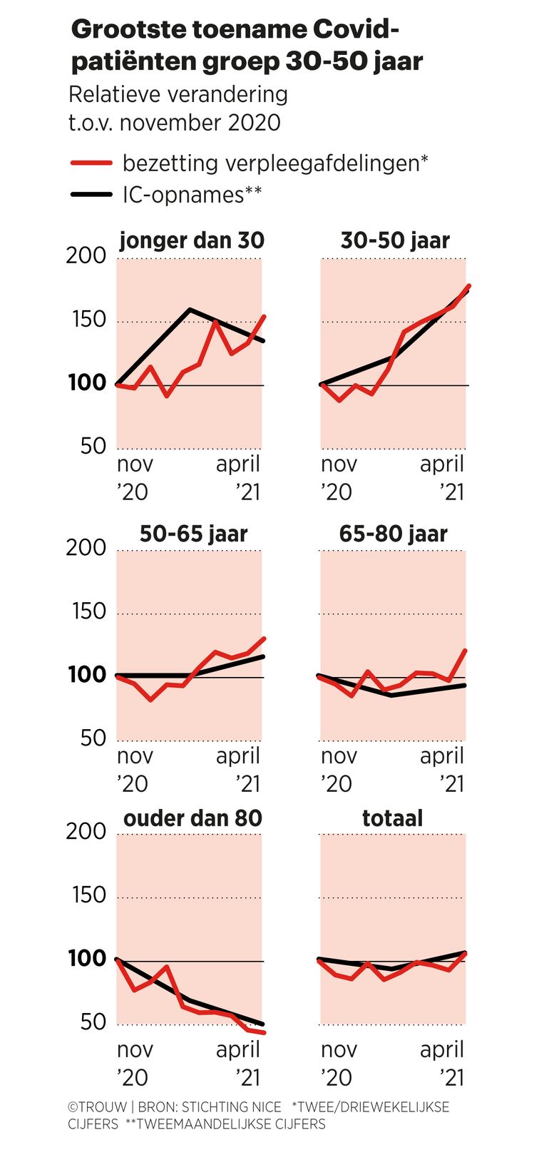 Zo werden in maart en april (tot de 29ste) van dit jaar 294 coronapatiënten tussen de 30 en 50 opgenomen op de ic, ten opzichte van 263 in dezelfde maanden vorig jaar, toen de piek aan patiënten door de eerste golf in totaal veel hoger lag. Op de verpleegafdelingen liggen er nu ongeveer evenveel coronapatiënten als halverwege januari. Maar verreweg de grootste toename is er van patiënten tussen de 30 en 50 jaar.