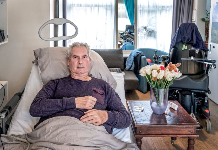 ‘Bovendien: de drain prikt steeds in mijn rug, dat is haast ondraaglijk. Ik moet elke dag meerdere keren morfine slikken om die pijn te onderdrukken. En dan nog is het nauwelijks vol te houden. Ik lig tegenwoordig 22 uur per dag op bed. In mijn rolstoel zitten is al bijna te pijnlijk. Als ik eenmaal zit, moet ik een half uur afkicken van de pijn.